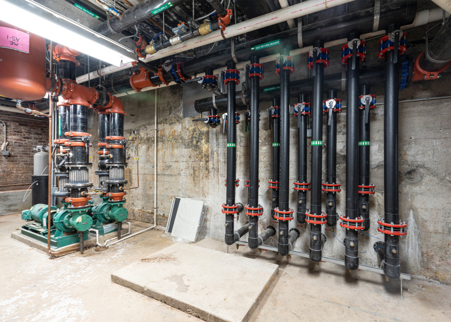 Key upgrades included replacing the outdated propane-fired boiler and fluid cooler system with the GSHP solution, complemented by a decoupled Dedicated Outdoor Air System (DOAS) for efficient fresh air delivery. Twinned console heat pumps replaced classroom unit ventilators, providing greater resiliency, energy savings, and insulation by eliminating external penetrations. Similarly, the gym’s four gas-fired rooftop units (RTUs) were replaced with two heat pumps, delivering staged operation to efficiently meet variable loads. Envelope enhancements further contributed to energy savings, including closed-cell polyurethane foam at wall-to-roof junctions to reduce infiltration.